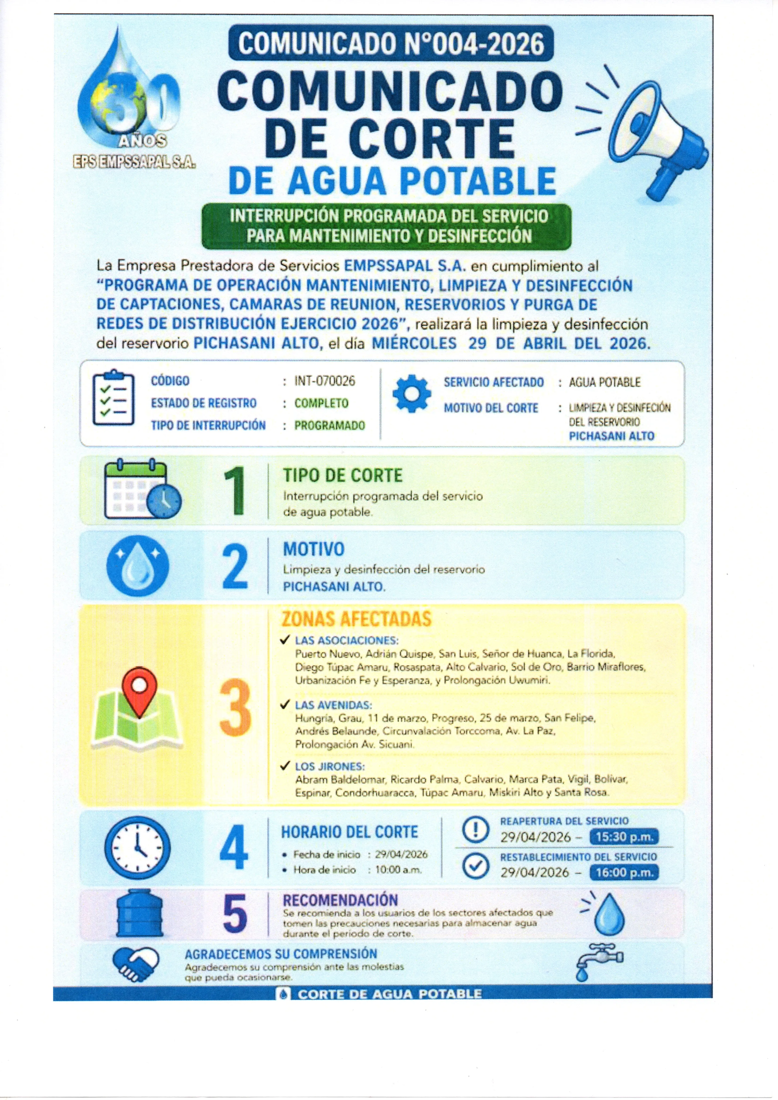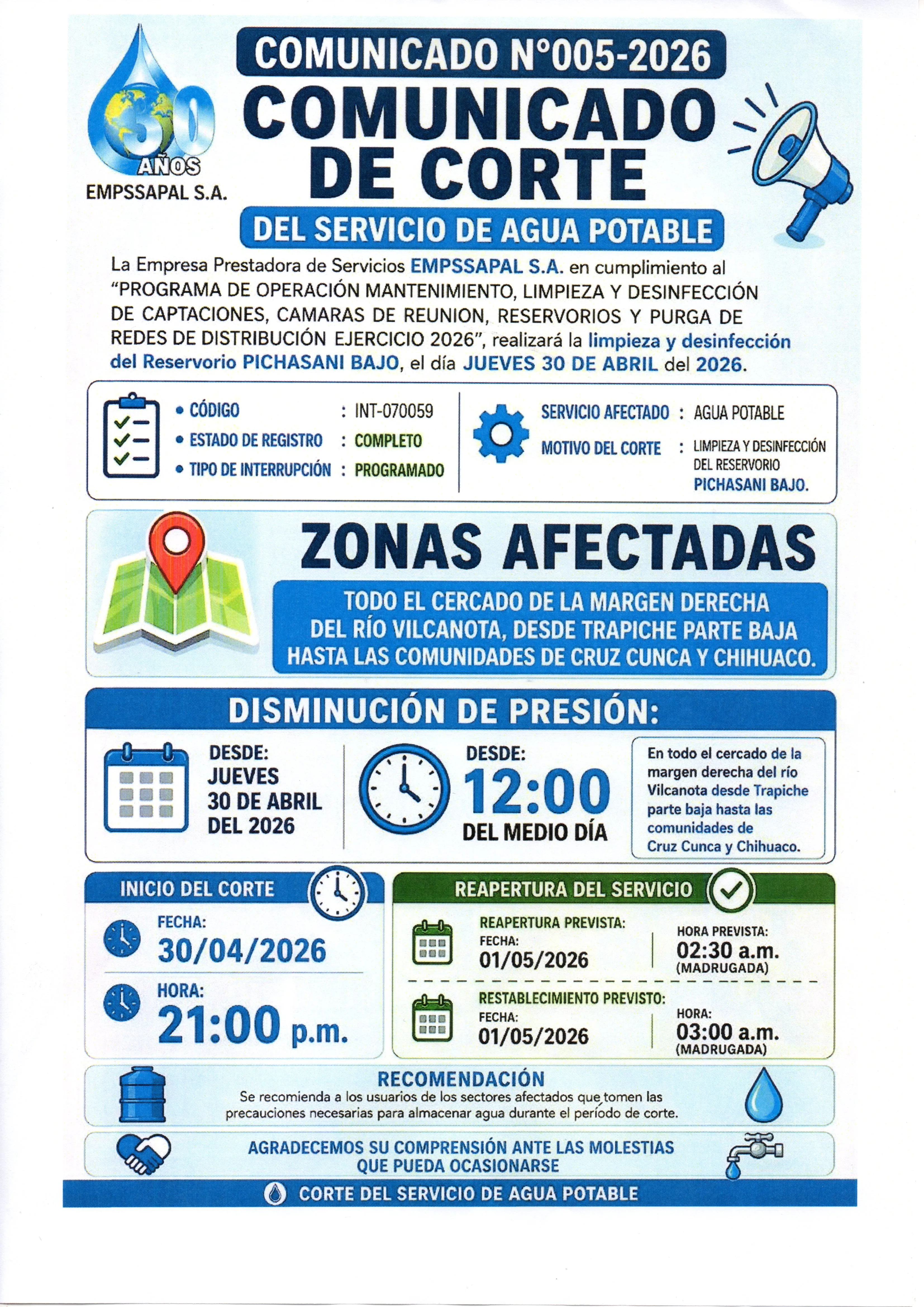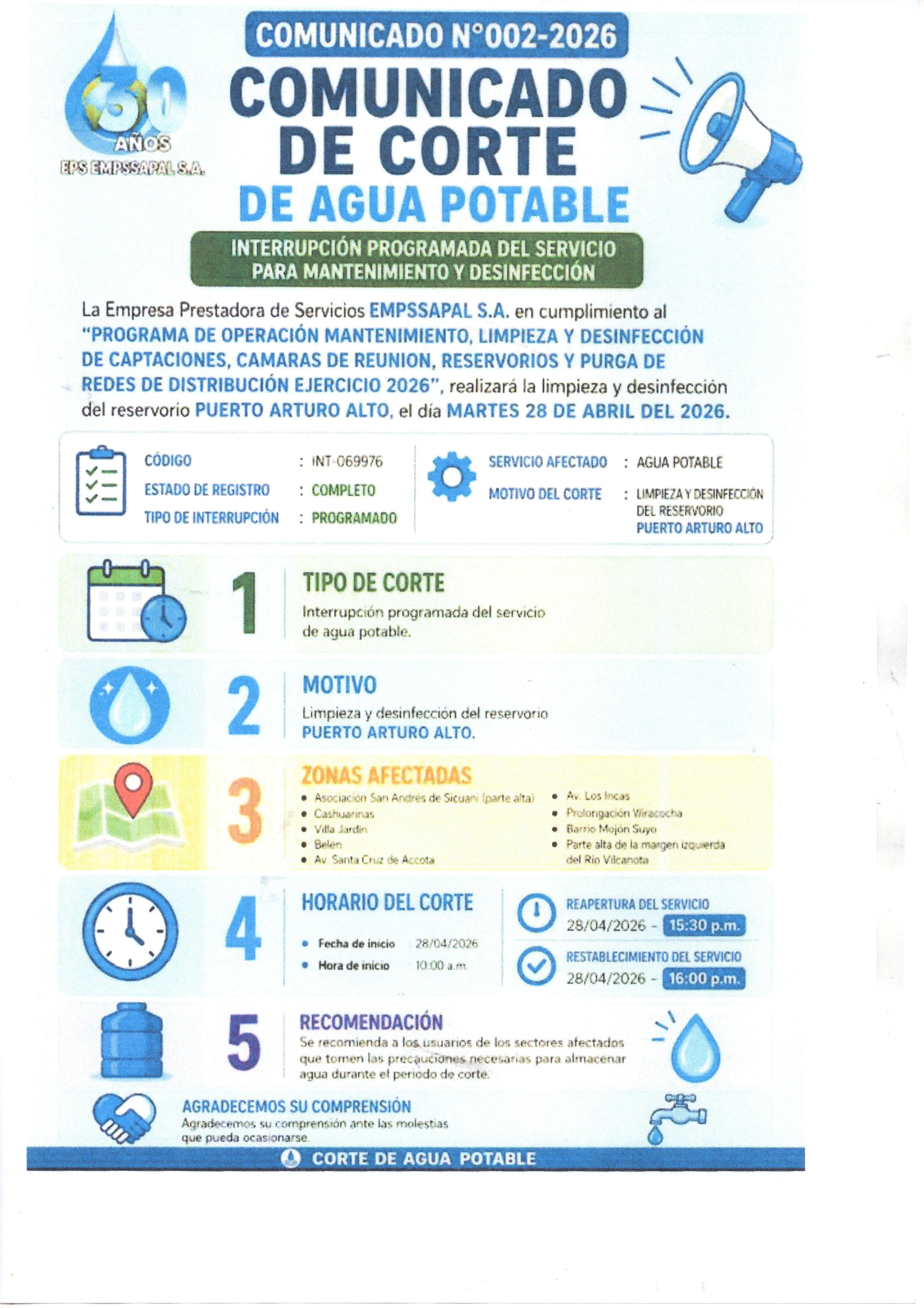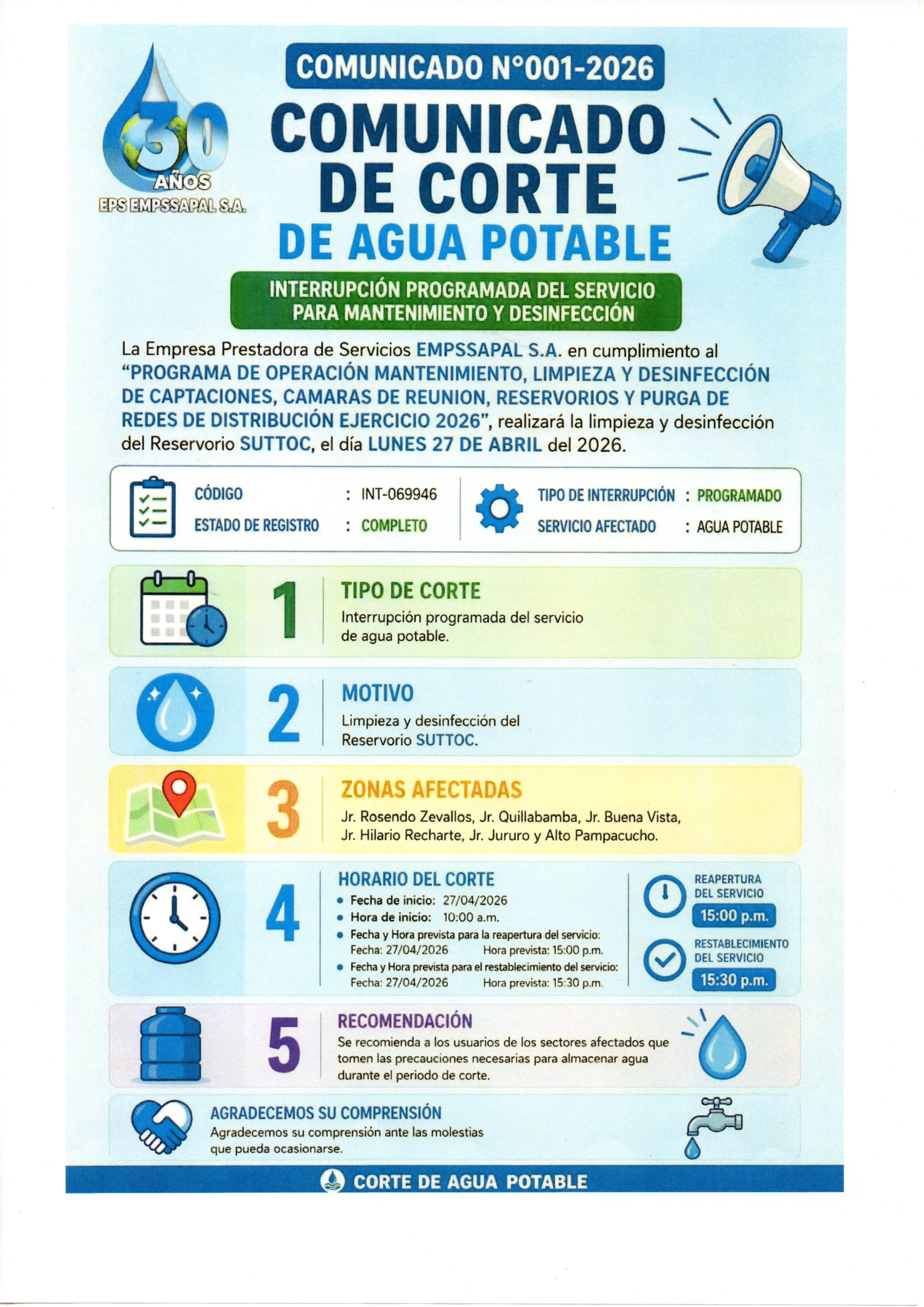 LIMPIEZA Y DESINFECCIÓN DEL RESERVORIO DE SUTTOC