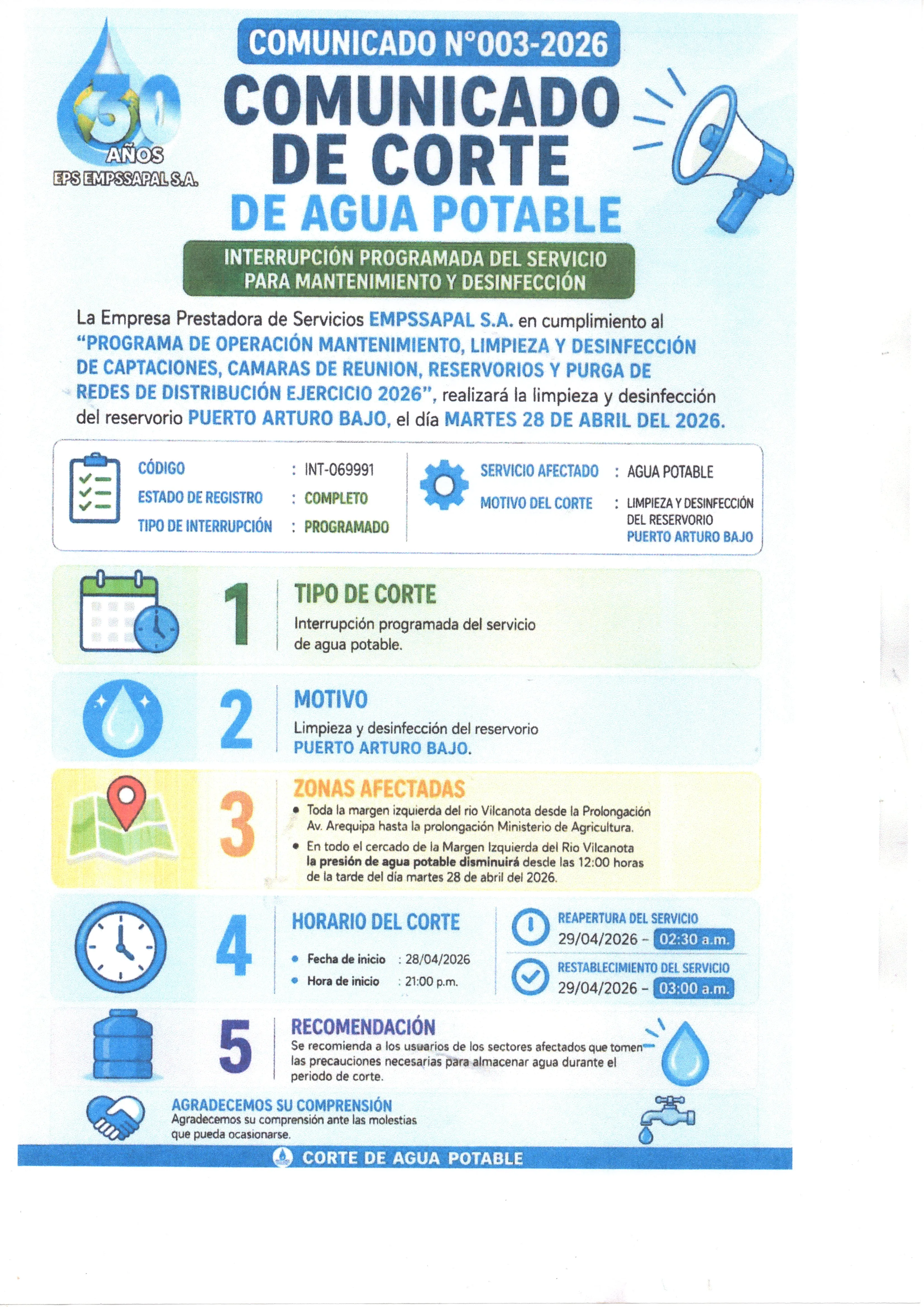 LIMPIEZA Y DESINFECCIÓN DEL RESERVORIO DE PUERTO ARTURO ALTO